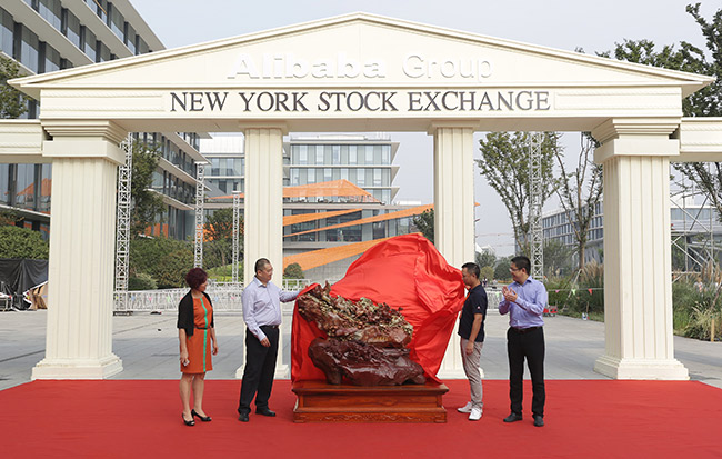 夏海钧总裁(左二)与阿里巴巴首席执行官陆兆禧(右二)共同为大型寿山石雕摆件《万马奔腾》揭幕